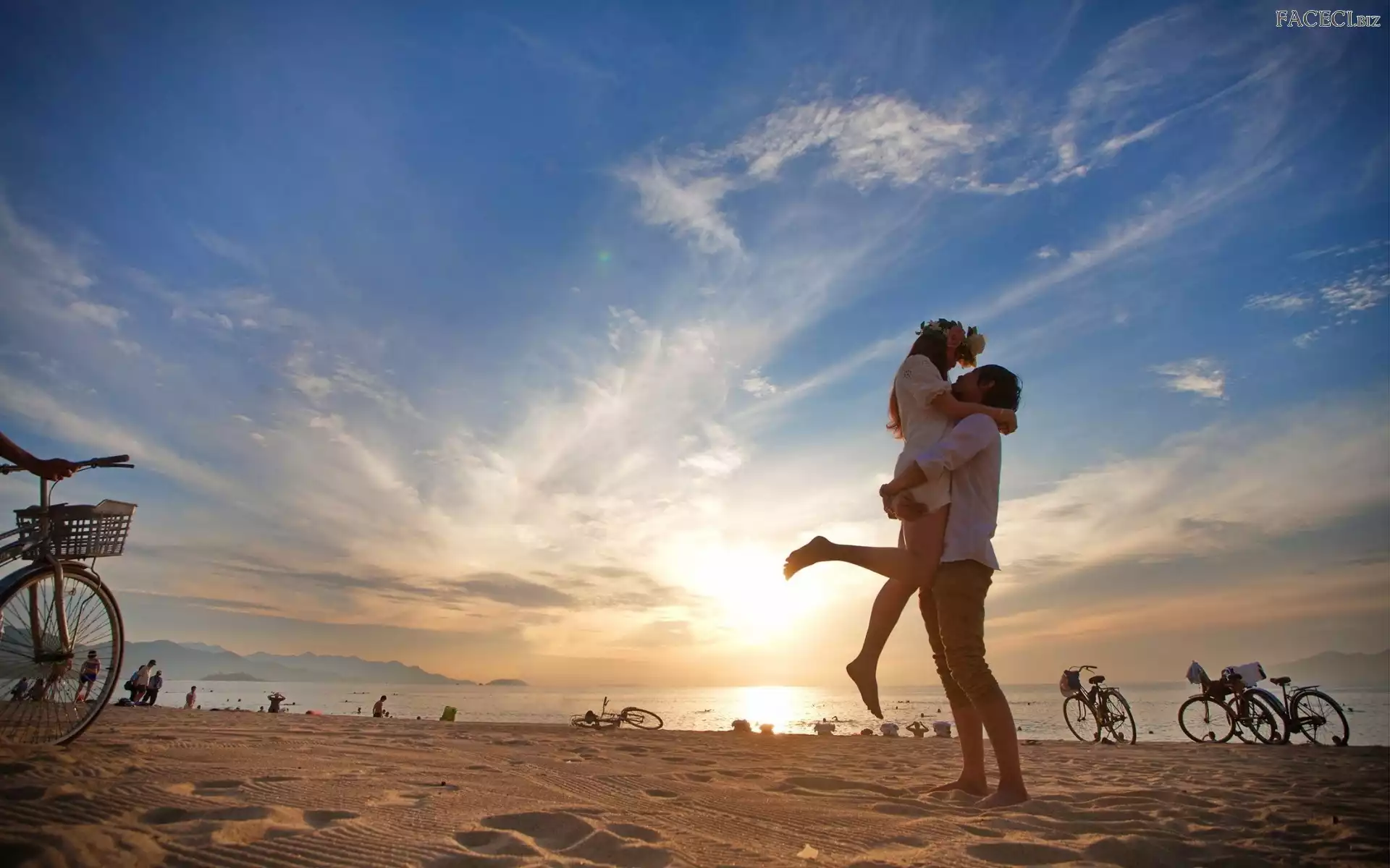 Chmury, Plaża, Zakochana, Ludzie, Morze, Para, Rowery - faceci.biz